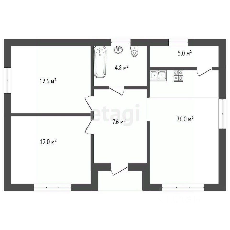 Общая площадь дома 72,4 кв.м. Планировка включает в себя две отдельные просторные спальни, большую кухню - гостиную и совмещенный санузел.