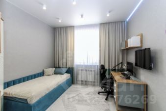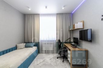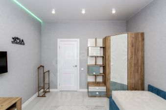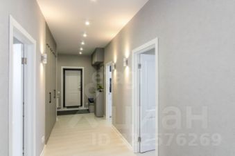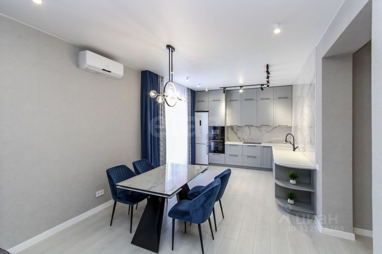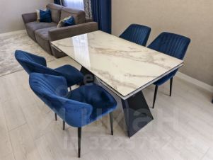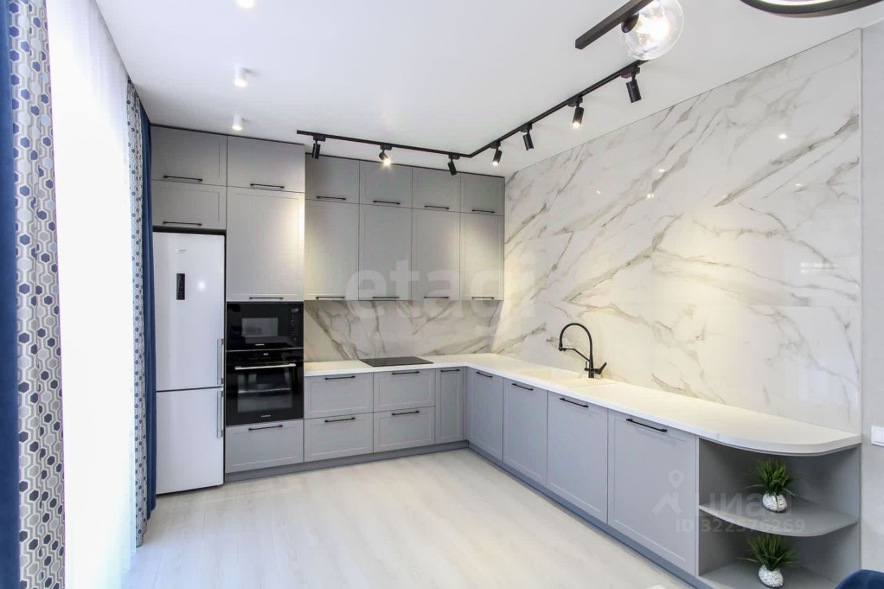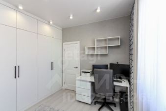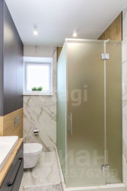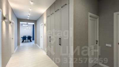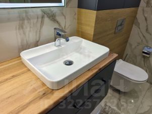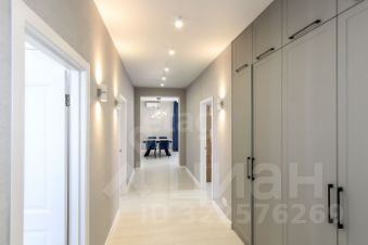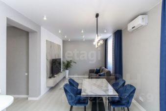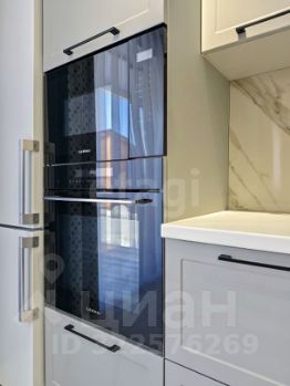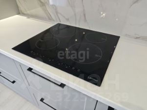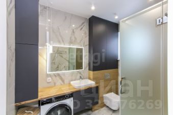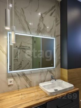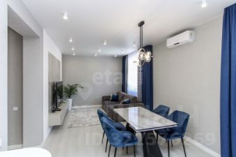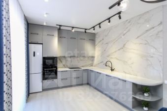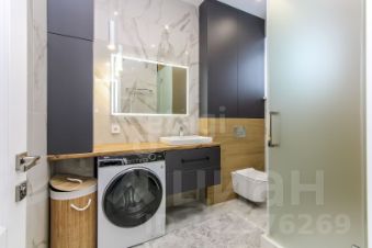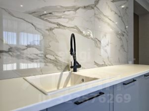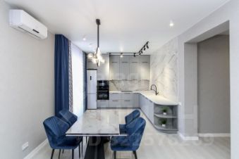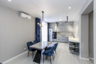 Санузел облицован плитами от "Kerama Marazzi", душевая кабина выполнена по индивидуальным размерам. Стены оформлены виниловыми моющимися обоями, натяжные матовые потолки со стильными спотами и трековой системой освещения. Встроенная кухня и шкафы оснащены фурнитурой "Blum". Вся мебель, встроенная техника и текстиль на окнах остаются новым владельцам.