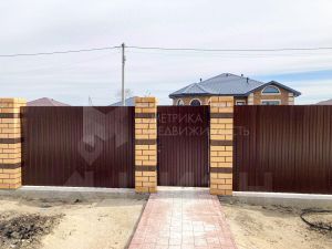 Забор: фасад из кирпича профнастил, установлены откатные ворота.