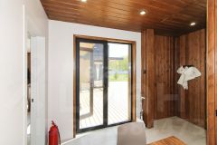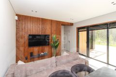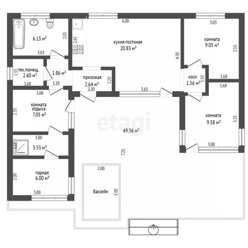 Планировка включает две спальни и просторную кухню-гостиную, объединенную в единое пространство. Дополнительные преимущества — частная сауна и бассейн на крыльце, что делает этот объект привлекательным для отдыха и приема гостей. Участок позволяет разместить зону барбекю, сад или даже мини-поле для активных игр.