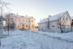 Крыльцо выполнено в гранитном исполнении с кованными перилами.