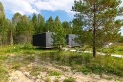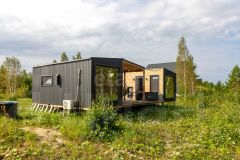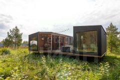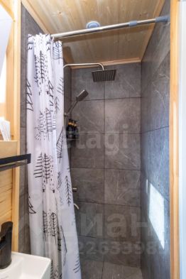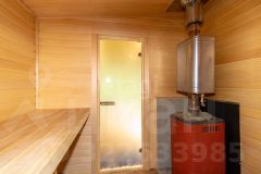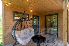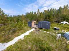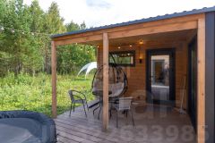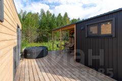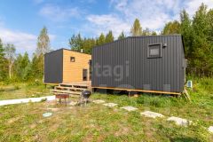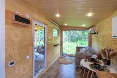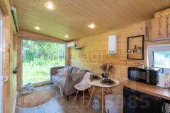 Дом состоит из 2-х комнат с деревянной обшивкой стен, в кухне-гостиной остается кухонный гарнтитур с техникой (холодильник, СВЧ-печь), обеденная зона, также здесь установлен проектор, проведен wi-fi, имеется система очистки воздуха и кондиционер. В спальне стоит вместительная кровать, установлен приточный клапан. В санузле организована душевая с отделкой герамогранит. Качественный бойлер с большим объемом бака (50 л) не оставит вас без горячей воды. Обогревается дом за счет теплого пола и конвекторов отопления.