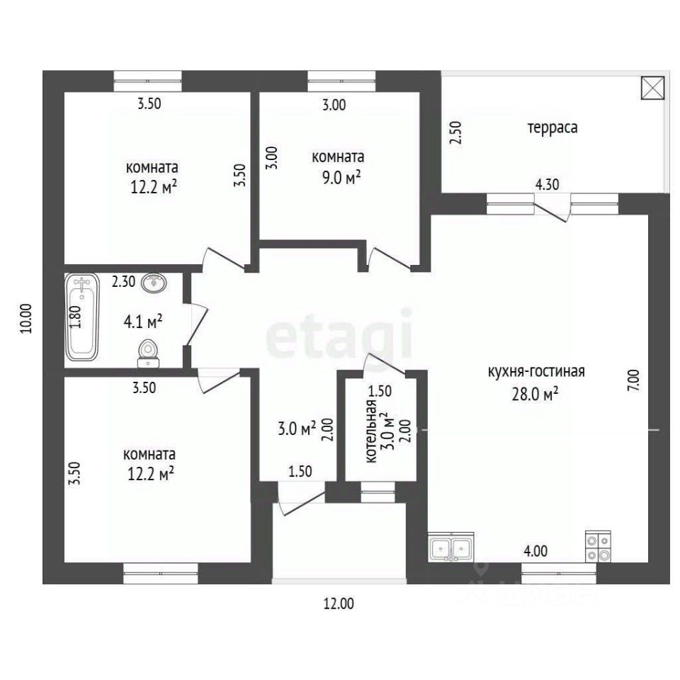 Внутренняя планировка - три спальни, кухня-гостиная с выходом на крытую террасу, совмещённый санузел, котельная и прихожая.
