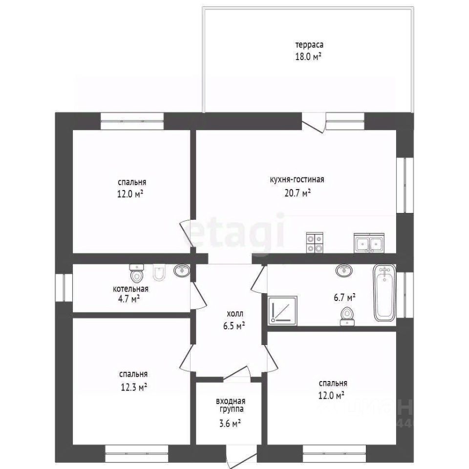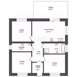 Три светлые и комфортные жилые комнаты, Просторная гостиная совмещённая с кухней, где удобно разместится вся семья и гости, Котельная, оборудованная электрическим котлом, обеспечивающая комфорт и тепло круглый год, санузел. Терраса для отдыха и приятного времяпровождения летом.