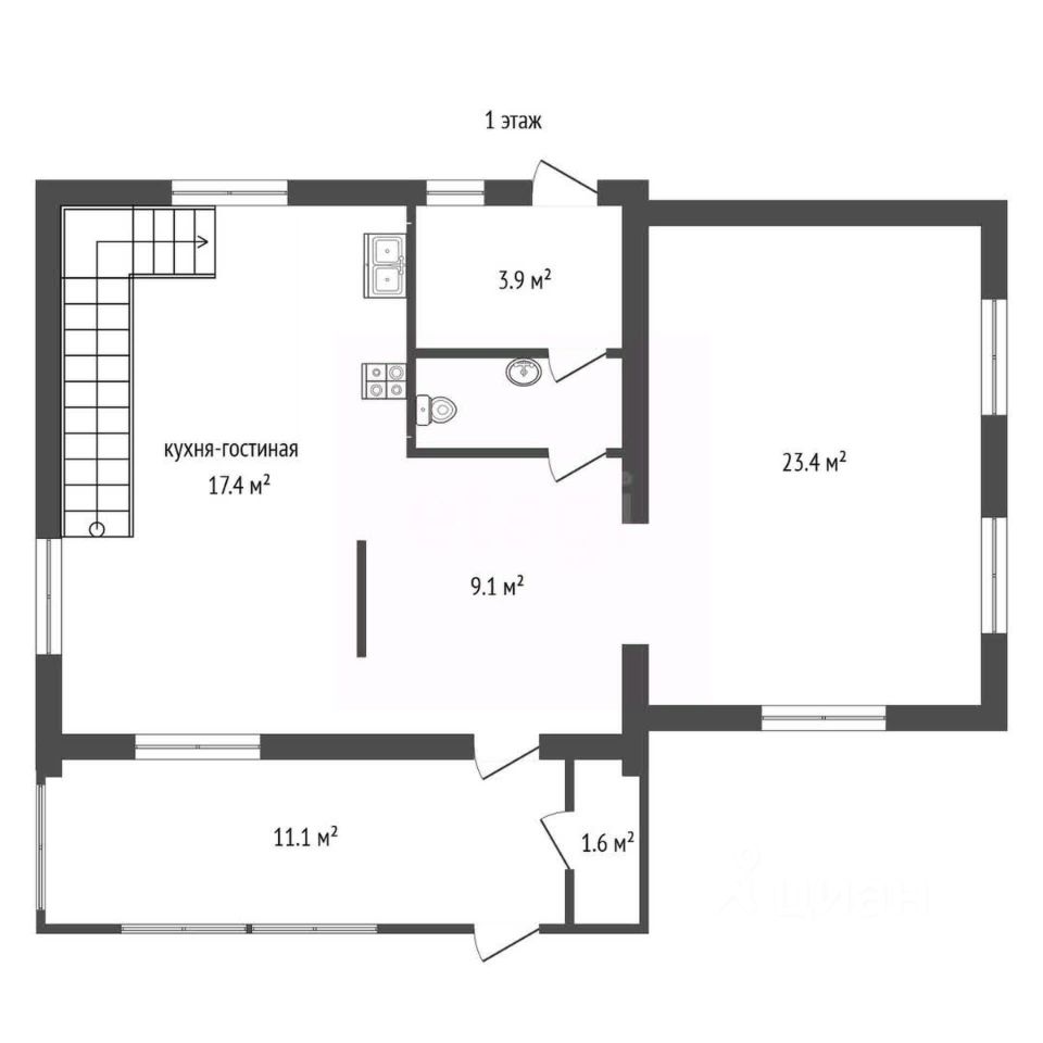 На первом этаже просторная кухня, гостиная, санузел.