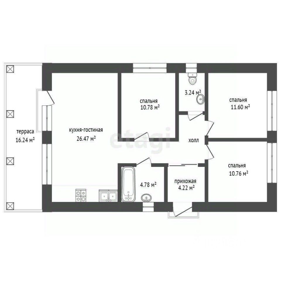 В доме 3 просторных спальни по 10-11 м2, просторная кухня-гостиная 26.47м2 с выходом на террасу (есть варианты домов с уже выполненной террасой 16м2), ванная комната 4.7 м2, прихожая 4.2 м2, а также котельная 3.2 м2, с заведенным электричеством 15 кВ, 380 В, бойлером, местом под газовый котел (газ в перспективе), скважиной (30м). В котельной предусмотрен выход под центральную воду (ее обещают подключить уже в 2026г.)