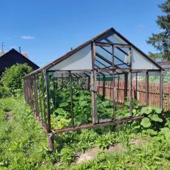 На участке есть некоторые садовые культуры - ягодные кусты и молодые деревья. С задней стороны участок ограждения соседским забором, с других - установлено временное ограждение.