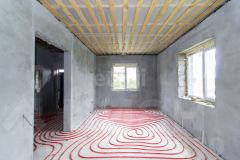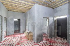 Стены в внутри дома выровнены под маяк ,ошпаклеваны и подготовлены под чистовую отделку. Вода (скважина) заведена в дом. Водоотведение осуществляется в переливной септик, расположенный у границ участка.