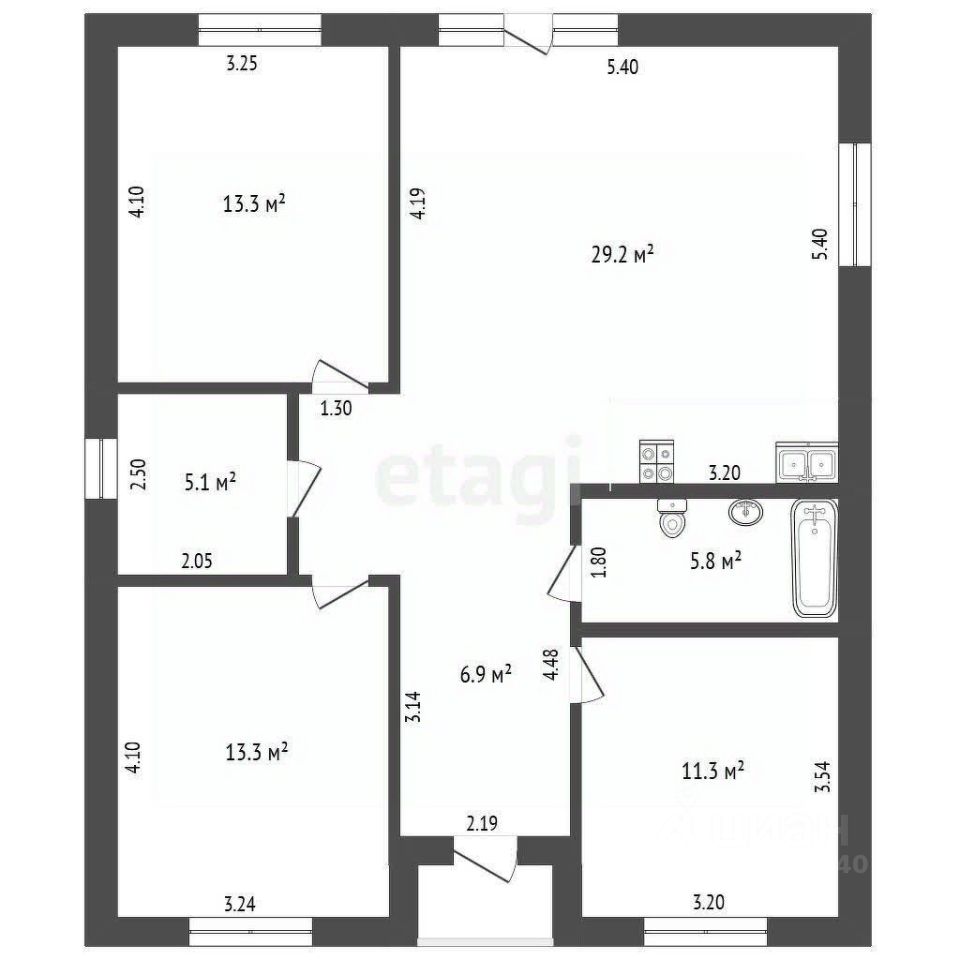 Площадь дома 88 кв.м., три спальни, большая кухня-гостиная, санузел, прихожая и отдельная котельная.