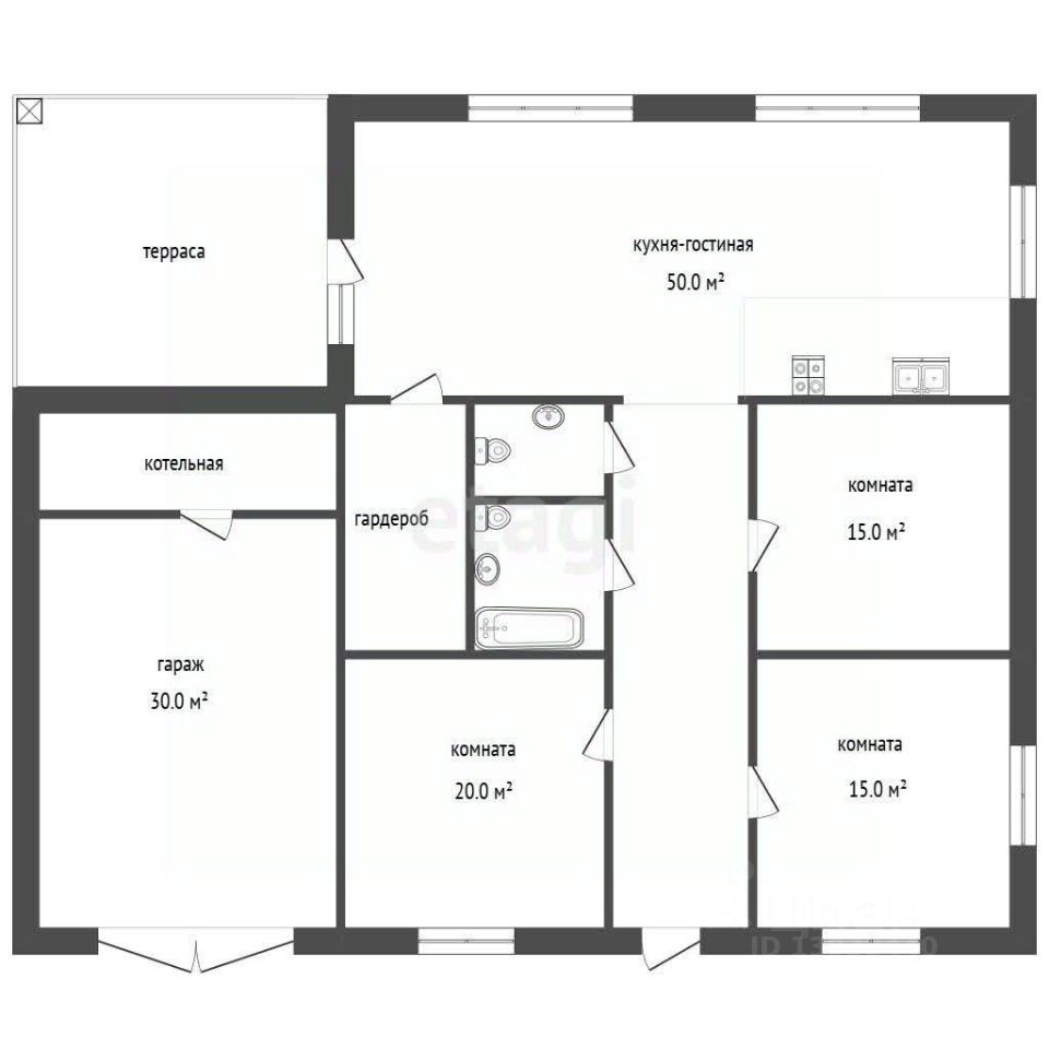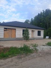 Дом в один этаж, в кухне -гостинной второй свет (50 м2), выход на террасу, три спальни (15-20м2), 2 санузла, гардеробная, котельная в гараже.