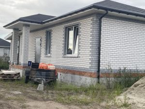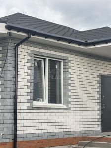 Дом выполнен из керамзитобетонных блоков, фасад облицован кирпичом, кровля -мягкая черепица.