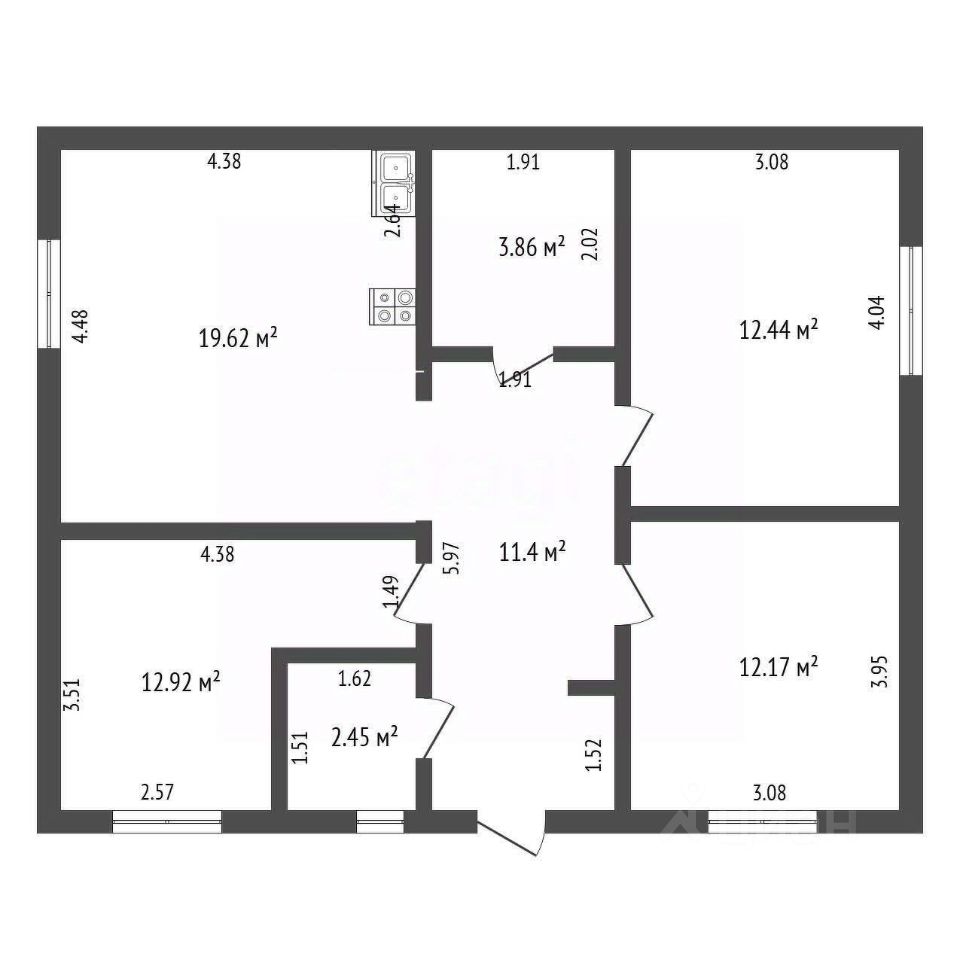 Кухня-гостиная, три спальни. Материал стен керамзитобетонный блок, утеплен и облицован кирпичом.