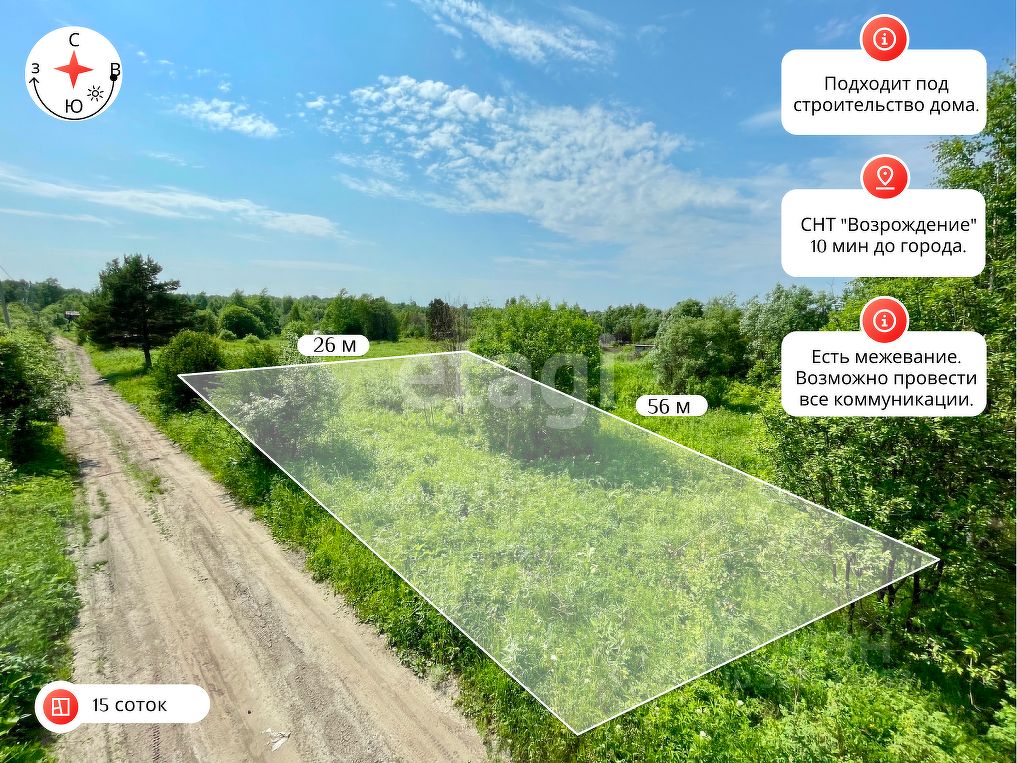 Уважаемые покупатели! Представляю вашему вниманию земельный участок в СНТ "Возрождение". Локация СНТ отличная, находится в 10 минутах езды от города, автобусную остановку установили непосредственно в самом СНТ, поэтому добраться туда общественным транспортом тоже можно. Еще огромным плюсом является то, что туда проведен газ, столбы электроснабжения у каждого участка рядом. В связи с этим , многие начинают там строить капитальные дома для постоянного проживания. Дороги в зимнее время чистятся. Единственно нужно будет бурить скважину для того, чтобы провести водопровод. Участок 15 соток земли, место ровное, не топит.