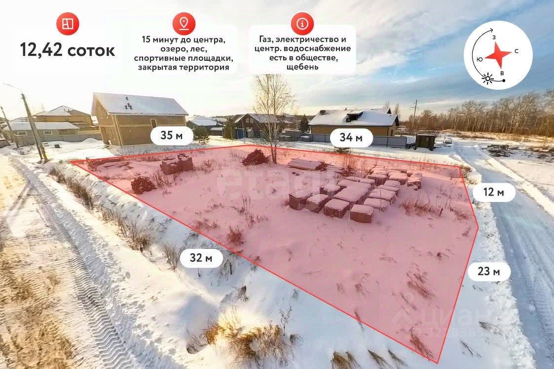 В поселке проведен газ, электричество, центральный водопровод. В шаговой доступности расположены спортивные площадки, озеро и лес. Уникальное тихое чистое место в черте города.
