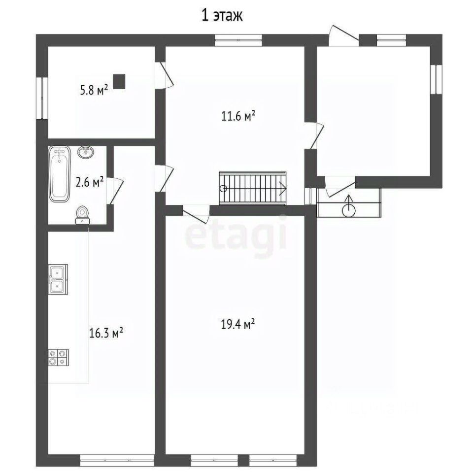 Внутри вас ждет удобная планировка: на первом этаже светлая кухня (16.3 кв.м.), просторная комната (19.4 кв.м.) и санузел с ванной (2.6 кв.м.). Здесь уже установлены газовая разводка, котел и центральное водоснабжение. На втором этаже находятся четыре комнаты (17, 9, 9 и 21 кв.м.), которые можно использовать как спальни, кабинеты или игровые.