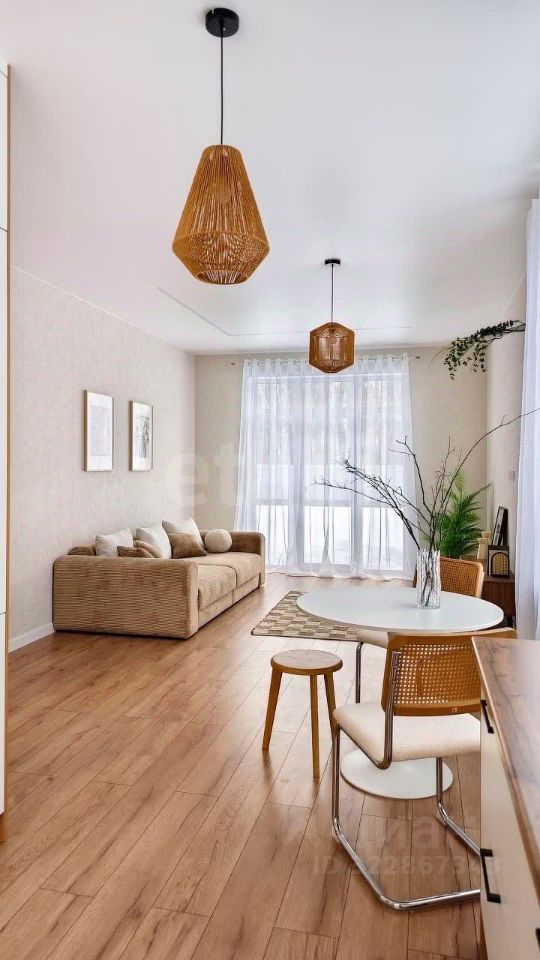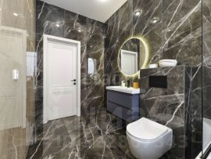 Потолки — натяжные с точечными светильниками и дизайнерскими люстрами.