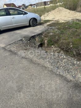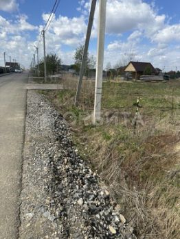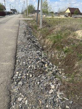 Асфальтированная дорога с заездом на участок, газовый стояк, электрический столб.