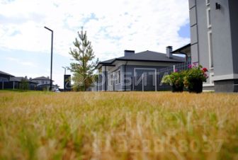 Современный стильный дом ,перед домом высажен газон, придомовая территория облагорожена брусчаткой.