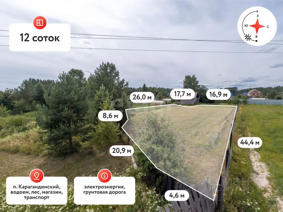 Земельный участок площадью 12 соток расположен в поселке Карагандинский на возвышенном угловом месте, что обеспечивает панорамный обзор и хорошую инсоляцию в течение всего дня. Участок подходит для строительства капитального дома или дачи — рельеф ровный, без заболоченных зон, грунты устойчивые. Существует возможность разделения на два самостоятельных участка с отдельными подъездами, что повышает инвестиционную привлекательность объекта. Электричество подведено к границе участка, что сокращает сроки и затраты на подключение.