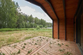 Дом компактный, при этом умещает в себе кухню-гостиную (кухня, зона ТВ и диван), спальня, санузел и уютная терраса, откуда открывается прекрасный вид на лес.