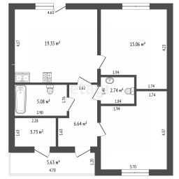Планировка: 2 спальные комнаты по 15 кв.м. с нишами под шкафы, кухня-гостиная 20 кв.м. с выходом на террасу и витражным остеклением, 2 санузла, прихожая с нишей под шкаф-купе, котельная