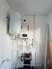 Внутри установлен электрический котел, водонагреватель и система теплого пола на первом этаже, а центральное водоснабжение и переливной септик обеспечивают комфортное проживание.