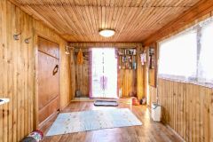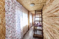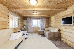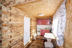 Дом выполнен из бревна и обшит. Окна деревяные. На первом этаже выполнен хороший ремонт. Просторная светлая комната. Кухня оборудована кухоным гарнитуром с электро плитой и обеденной зоной. На закрытой терассе еще одна комната с лесница на второй этаж.