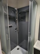 Санузел расположен внутри дома, оборудован современной душевой кабиной. Водоснабжение осуществляется из собственной скважины, а для удобства жильцов установлен водонагреватель. Дом подключен к септику, что делает его автономным и удобным для проживания.