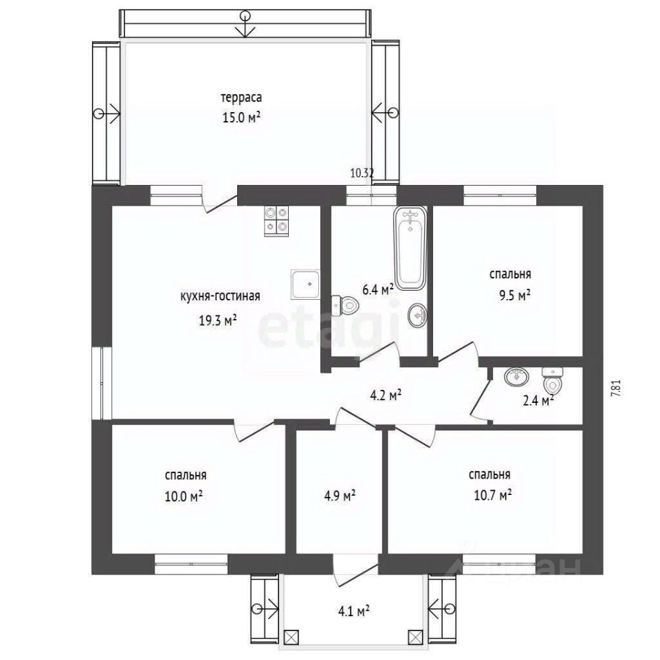 Площадь дома 65м2, однако планировка дома очень эргономичная. В доме 3 спальни по 10м2, кухня-гостиная 19.3м2, ванную, санузел и тамбур.