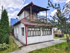 Дом построен из кирпича, утеплен пенопластом и обшит сайдингом с водосточной системой. Ленточный фундамент гарантирует надежность конструкции. На первом этаже расположены прихожая, кухня и отдельная спальня, на втором — комната с выходом на балкон с видом на участок.