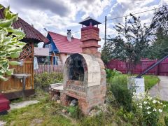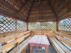 Рядом расположена большая беседка с электричеством и подведенной скважиной, что делает отдых на свежем воздухе еще удобнее. Кирпичный мангал позволяет готовить на открытом огне в любую погоду.