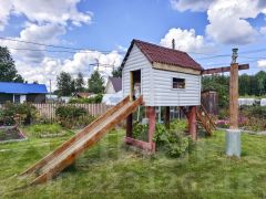 Участок площадью 6 соток полностью благоустроен и продуман до мелочей: здесь есть все необходимое для комфортного отдыха и ведения хозяйства. Основные постройки включают жилой дом, баню, теплицу, кирпичный мангал, просторную беседку, детскую площадку с горкой и песочницей, качели, колодец, летний душ и туалет, а также хозблок для хранения инвентаря. Территория огорожена забором, что обеспечивает приватность и безопасность.