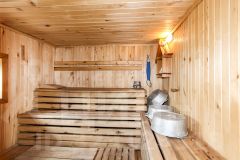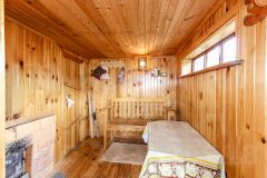 Баня, также построенная из бруса на фундаменте, включает предбанник и парилку с рабочей печью.