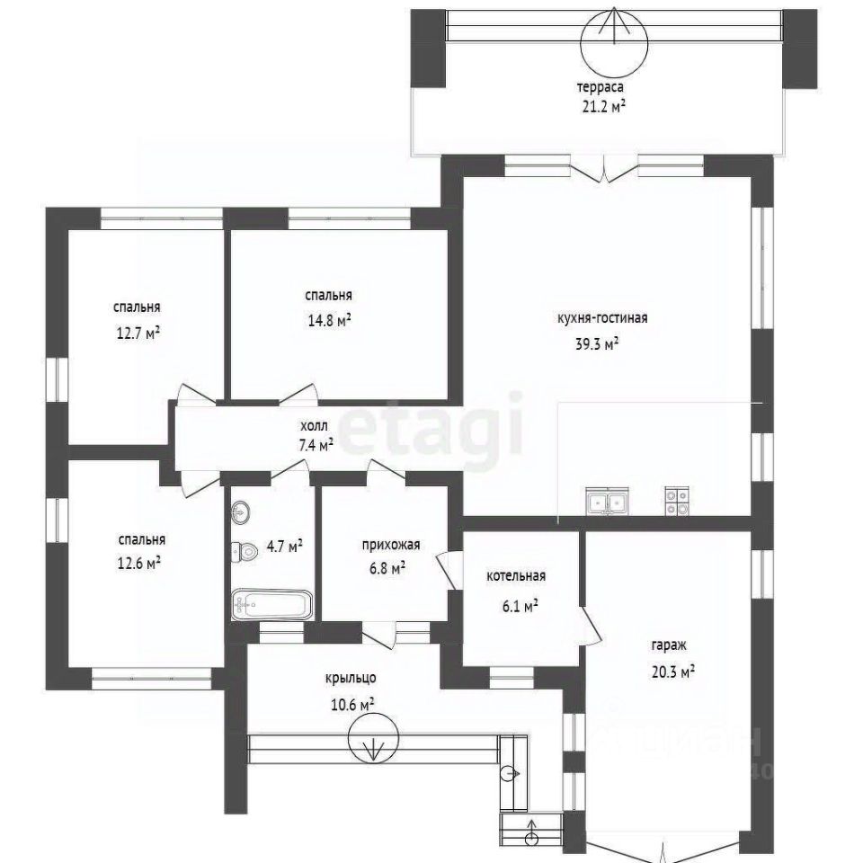 По планировке - три спальни 12,6/12,7 и 14,8 кв.м, последняя из них с выходом на террасу, просторная кухня-гостиная 39,3 кв.м и подсобное помещение- котельная 6 кв.м.