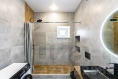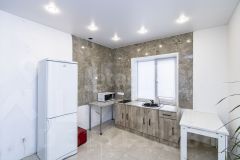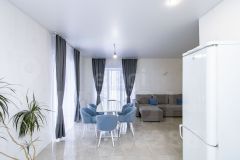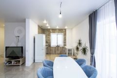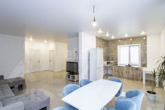 Дом с современным ремонтом: белые матовые натяжные потолки и двери придают ему стильный вид, а полы в комнатах выполнены из качественных материалов кварцвинила, ламината и керамогранита, что обеспечивает долговечность и легкость в уходе. Установлен фартук из керамогранита для будущего кухонного гарнитура. Высокие потолки объемом 3 метра создают атмосферу простора и легкости.