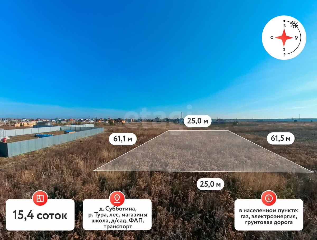 Земельный участок в деревне Субботино, расположенной всего в 11 км от Тюмени по Старотобольскому тракту, предлагает редкое сочетание доступной транспортной логистики и преимуществ загородной жизни.