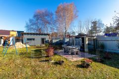Ухоженная территория с плодовыми насаждениями и зоной для отдыха:
