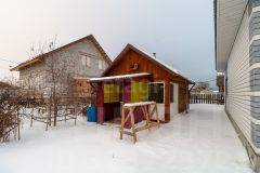 Благоустроенная территория включает обработанный приусадебный участок, баню, дровник и теплицу, позволяя сразу заняться садоводством или организацией зоны отдыха.