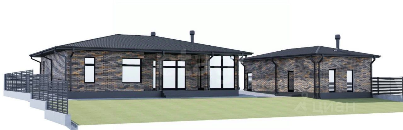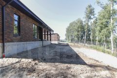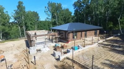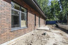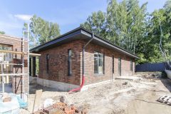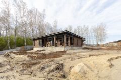 Одноэтажный жилой дом с гаражом на два машино места и баней которой окна выходят на безграничные луга построен на прочном плитном фундаменте с ростверком. Использованы качественные материалы: арболитовые блоки, утеплитель ППС и керамический кирпич(толщина стены 520 мм) . Высота потолков — 3,2 метра, что создает ощущение простора и света. В гараже установлена ворота с автоматикой.