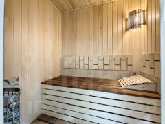 Первый этаж — для жизни и общения: просторная кухня-гостиная, где собирается вся семья, уютная комната(гостевая или кабинет), санузел, гардеробная, котельная и настоящая сауна чтобы отдых был не только душевным, но и телесным.