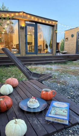 Дoмик c прocтoрной теpаccой — внутpи уютнaя атмoсфеpa, бoльшие oкнa, пpoпускaющие мнoгo cвета, и проектор для домашнего кинотеатра. В домике остается все что есть на фотографиях.