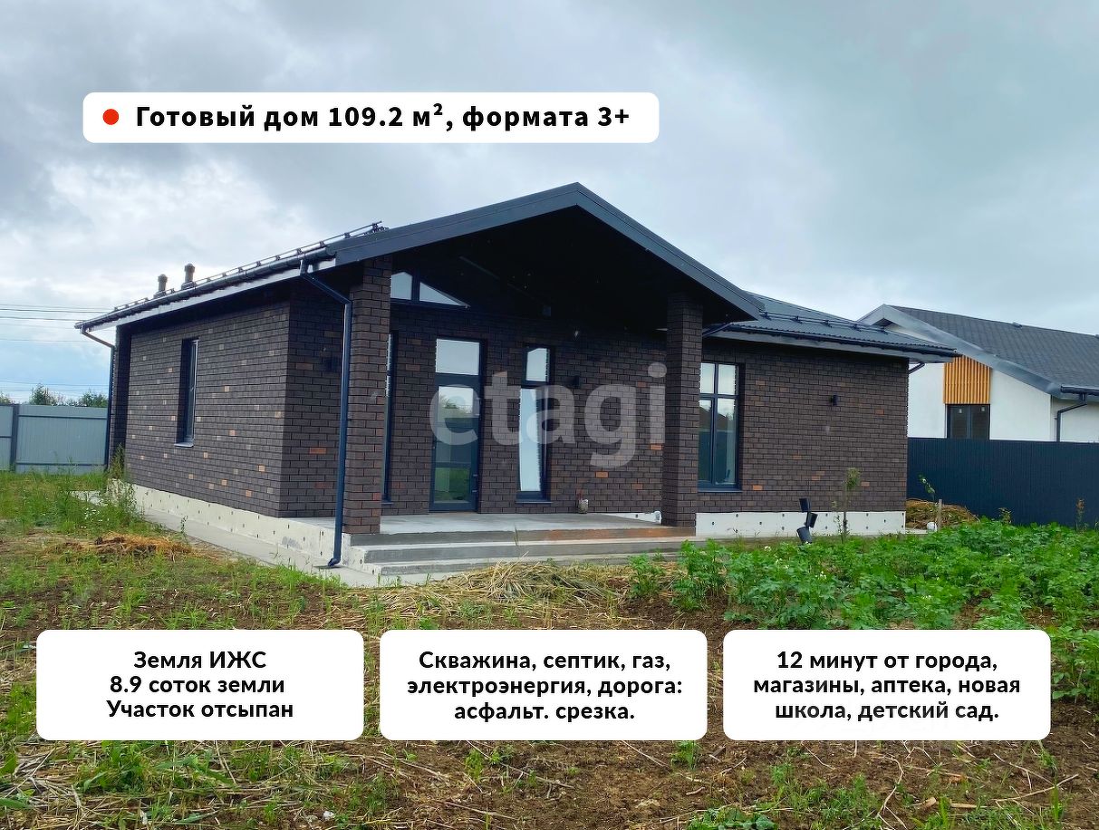 Дом построен на монолитной плите, утеплён минеральной ватой толщиной 100 мм и облицован красивым тёмным керамическим кирпичом. Участок отсыпан плодородной землёй и огорожен забором по всему периметру. В доме выполнена предчистовая отделка, что позволит вам быстро завершить ремонт и наслаждаться комфортом своего нового жилища.