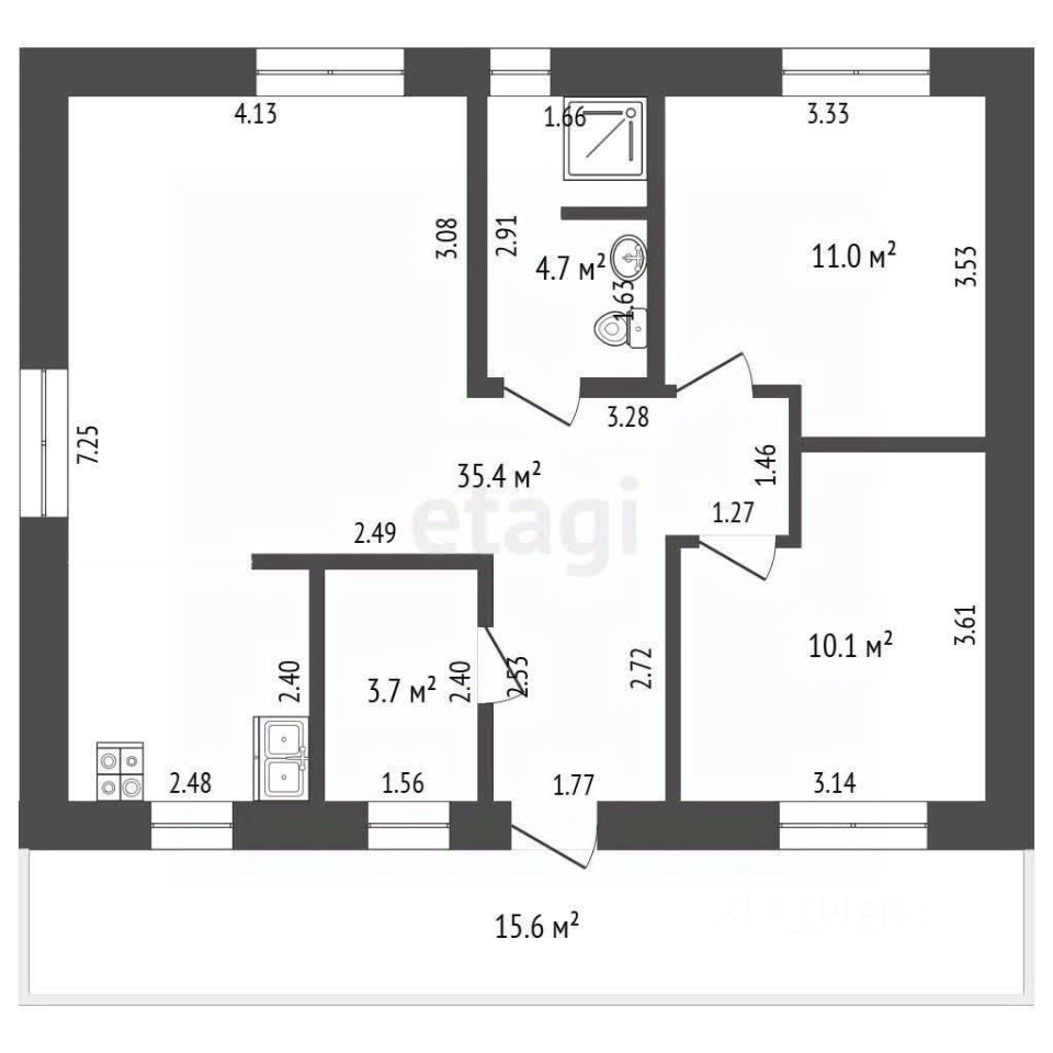 Общая площадь дома 84 кв.м., из них кухня-гостиная 35 кв.м.; просторный коридор, 2 спальни, котельная и сан.узел, терасса 15 кв.м.