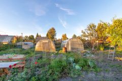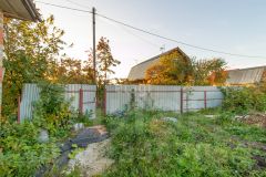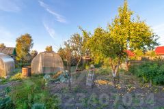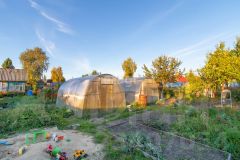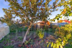Ухоженная территория полностью огорожена забором из профнастила и отличается развитой инфраструктурой: здесь присутствуют плодовые деревья, ягодные кустарники, две теплицы и колодец.