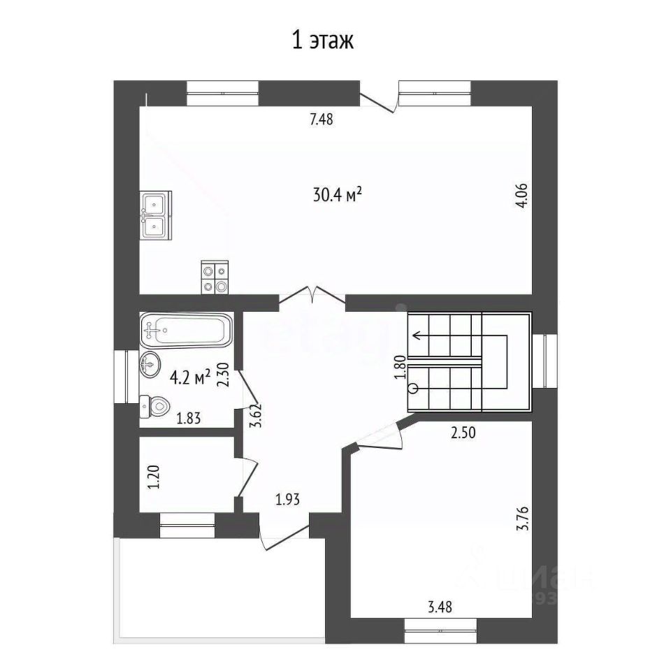 Четыре отдельные комнаты, большая кухня-гостиная, 2 санузла, хозяйственная комната и котельная.