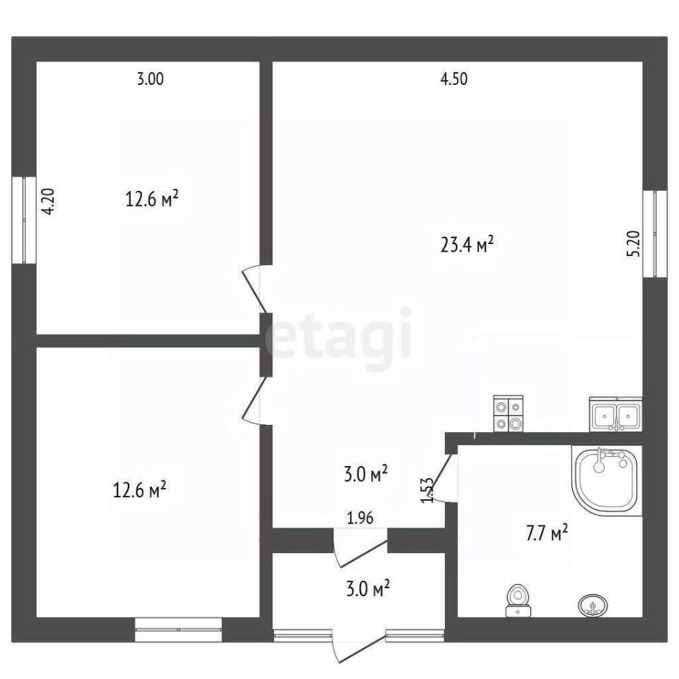 2. Планировка: две спальные комнаты, большая гостиная с зоной кухни, совмещенный санузел. В доме нет бесполезных коридорных квадратов, из тамбура вы сразу попадаете в просторную гостиную, и из нее уже отдельные выходы в спальни и ванную.