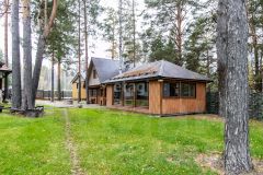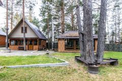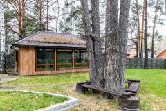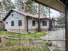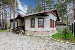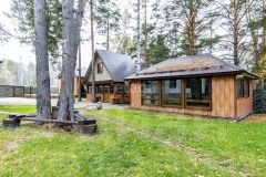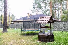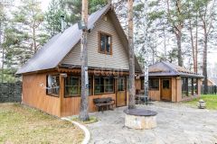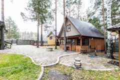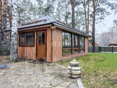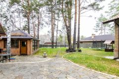На территории есть круглогодичная беседка с панорамным остеклением, в которой кухонная зона оснащена всем необходимым (в беседке установлено отопление, теплый пол, кондиционер. Видовые характеристики беседки ( шикарный вид на сосны с панорамных окон)