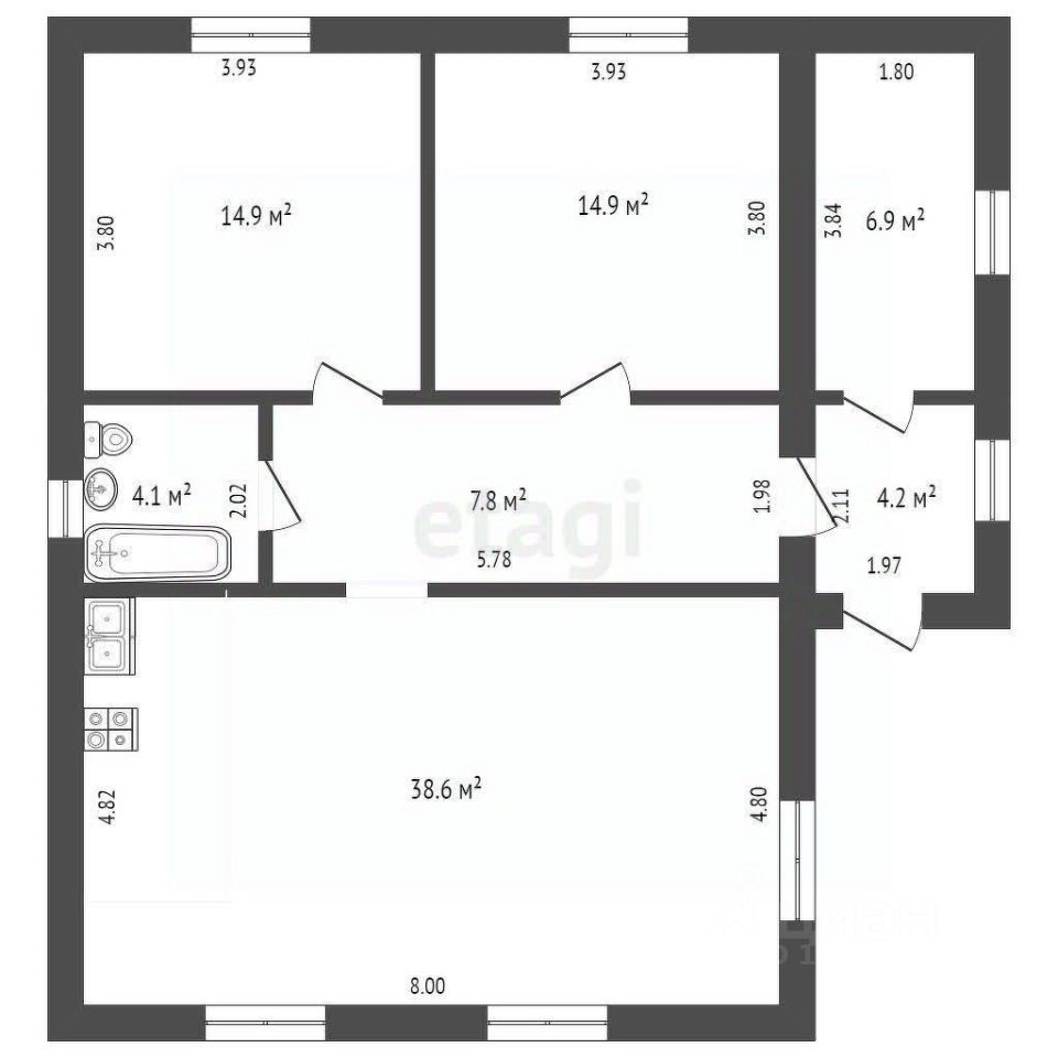 Дом имеет 3 комнаты: 2 отдельные комнаты и большую кухню-гостиную, в которой при необходимости можно выделить еще одну большую комнату.