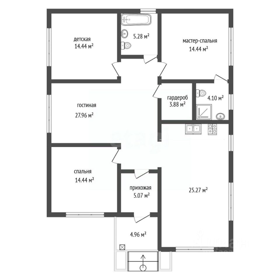 Дом возведен из газоблоков с облицовкой керамическим кирпичом, что обеспечивает высокую энергоэффективность и долговечность конструкции. Фундамент — монолитная плита толщиной 300 мм, гарантирующая устойчивость и надежность. Планировка включает просторную кухню-гостиную площадью 25 м², идеально подходящую для комфортного отдыха и приема гостей, а также три изолированные комнаты по 14 м² каждая, что позволяет удобно организовать личное пространство для всех членов семьи.