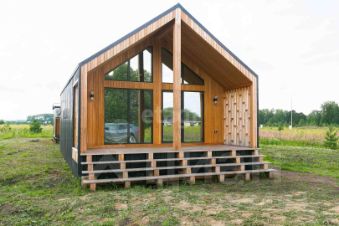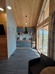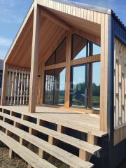 Дом состоит из большой террасы, кухни-гостиной, спальни, прихожей, санузла и технической комнаты (в которой расхоложены все инженерные системы). В просторной кухне-гостиной, с панорамными окнами, открывается шикарный вид на лес, а теплыми вечерами можно наслаждаться пением птиц на просторной террасе.